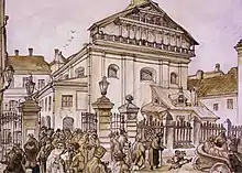 The Great Synagogue of Vilnius, which once stood at the end of Jewish Street (I-2), Vilnius, Lithuania, was built between 1630 and 1633 after permission was granted to construct a synagogue from stone. Standing on the spot of an existing synagogue built in 1572, the site had first been used to house a Jewish house of prayer in 1440. Damaged in World War II, it was demolished in 1955–1957 and replaced by a kindergarten and a primary school.