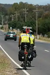 Hazard and direction signs, rest stops, and route marshals are organised for the ride each day. These include riding marshals who head out each day before participants to direct riders safely through pre-determined locations such as intersections and rest stops, and marshals on motorbikes who form the backbone of communications out on the course by monitoring rider progress and resolving issues as they occur (including first response medical support). A group of volunteer riders called WARBYs (We Are Right Behind You) ride throughout the field, providing emergency assistance for bicycle breakdowns and rider difficulties.[4][6] A number of sag wagons accompany the ride to pick up riders and bikes who are unable to continue due to their bicycle being beyond roadside repair, injury, sickness, or general weariness.[7]