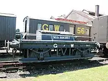 The operating department had a requirement for wagons to carry gas for carriage lighting. These were given the telegraphic code 'Cordon' and came in two distinct styles, with two long tanks along the length of the wagon (diagram DD5) or nine short tanks stacked across the wagon (DD4).[28] There were also match or 'shunting' trucks to connect broad and standard gauge wagons until the broad gauge was abandoned in 1892,[29] or to run with overhanging or dangerous loads.[30] These were originally just ordinary flat trucks run without a load, but in later years a number of old wagons were kept for this purpose and given diagrams L21 to L23. Cranes also had match trucks of various styles in diagrams L1 to L20.[30] Shunters' trucks were another kind of flat wagon and could be found in diagrams M1 to M5. These had full length footboards and handrails for shunters who rode on them during movements around or to and from stations and depots. These wagons carried a distinctive asymmetrical toolbox and usually had their depot name painted on this.[31]