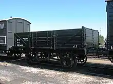 Specific wagons were built for special traffics, including diagrams O12 and O13 with end doors that allowed china clay to be unloaded into ships by tipping the whole wagon. Diagram O25 were built with hopper discharge in the floor for grain traffic, while O27 had strengthened underframes for their heavy tinplate traffic.[11] Diagrams N23, N24, N31 and N32 were large 20 ton iron opens built for coal traffic, many of which were hired to specific collieries or coal merchants at cheap rates as these were more efficient for the railway to haul than the 12 ton wooden vehicles that these businesses generally owned and operated themselves at the time.[12]