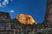 The Great White Throne[2] is a monolith, predominantly composed of white Navajo Sandstone in Zion National Park in Washington County in southwestern Utah, United States.[1] The north-west "main" face rises 2,350 feet (720 m) in 1,500 feet (460 m) from the floor of Zion Canyon near Angels Landing. It is often used as a symbol of Zion National Park. The Great White Throne can be seen from most locations along the scenic drive running through Zion Canyon.