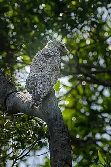Breeding has been recorded as typically February to August, but depending on the portion of this bird's range breeding birds can be met with almost year-round.[11] The nest is a slight depression on a thick tree branch,[12] at least 10 m (33 ft) above ground, with a single white (slightly spotted) egg measuring about 5.2 cm × 3.8 cm (2.0 in × 1.5 in). Few details are known of the brooding behavior, but about a month elapses before the offspring is seen alone at the nest. A chick of a few days old weighed 220 g (7.8 oz).[9] After about 5 weeks the nestling is a two-thirds version of the adult, but with a lighter build, paler plumage, shorter tail, and smaller bill with less rictal bristles. The fledging period must be at least 2 months. After this time span, the offspring do not return to the nest site.[9]