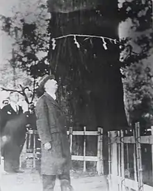 The tree stands 54.8 metres (180 ft) tall. At the base, it measures 11.5 metres (38 ft) in circumference and 3.41 metres (11.2 ft) across. At chest height, it is 9.6 metres (31 ft) around and 3.0 metres (9.8 ft) across. The tree splits into two trunks 4.9 metres (16 ft) above ground level. In 1928, Professor Manabu Miyoshi of Tokyo Imperial University estimated the age of the tree to be 2,300 years.
