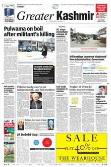 Greater Kashmir is an English daily newspaper printed and published from Srinagar, the summer capital of Jammu and Kashmir.[1] The newspaper initially began its edition in 1987 as a weekly newspaper and later, started its first daily publication in 1989.[2]