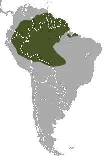 This armadillo is native to tropical northeastern South America. Its range includes Guyana, Surinam, French Guiana, Colombia to the east of the Andes, Venezuela to the south of the Orinoco River, and the Amazon Basin of Brazil, Ecuador, Peru and northeastern Bolivia.[5] It is a mammal of humid lowland forest in the basins of the Orinoco and Amazon. It also occurs in patches of forest in savannah areas.[2] It is common in forested areas in the uplands where less hunting takes place, and forages on floodplains near headwater streams, in palm swamps, on hill sides and hill tops.[8]