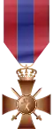 The medal's design is essentially a modification of the French Croix de Guerre, featuring a bronze cross pattée with the royal monogram (two crossed gammas and a crown) of King George II, atop two crossed swords, and topped by a royal crown. The reverse bears the date "1940". The ribbon features three equal alternating bands of red, blue and red. The cross was awarded in three classes, distinguished by the colour of the crown: bronze for the 3rd class, silver for the 2nd, and gold for the 1st class. Until 1942, the first award could be in any class, but according to Compulsory Law 3120/1942, the first award had always to be made in the 3rd class. Up to three subsequent awards remained in the same class (denoted by the number of miniature crowns on the ribbon), but the fifth and eighth awards upgraded the medal to the 2nd and 1st classes respectively. Several variations exist because many manufacturers were used, some in Greece and others in the United Kingdom, with minor variations in the style of the crown and the cross, as well as design of the obverse side (in some versions, the date lies within a circle).