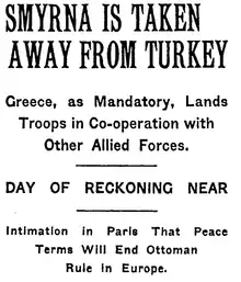 The Greek landing at Smyrna (Greek: Ελληνική απόβαση στη Σμύρνη; Turkish: İzmir'in İşgali, Occupation of İzmir) was a military operation by Greek forces starting on May 15, 1919 which involved landing troops in the city of Smyrna and surrounding areas. The Allied powers sanctioned and oversaw the planning of the operation and assisted by directing their forces to take over some key locations and moving warships to the Smyrna harbor. During the landing, a shot was fired on the Greek 1/38 Evzone Regiment and significant violence ensued with Greek troops and Greek citizens of Smyrna participating. The event became important for creating the three-year-long Greek Occupation of Smyrna and was a major spark for the Greco-Turkish War (1919–1922).