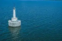 View of the Green Bay Harbor Entrance Light from a helicopter.