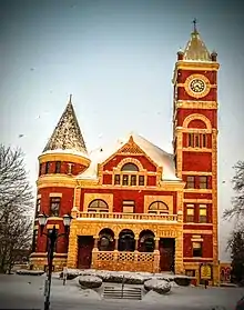 The Green County Courthouse, located on Courthouse Square in Monroe, is the county courthouse serving Green County, Wisconsin. Built in 1891, it is the county's second permanent courthouse. Architect G. Stanley Mansfield designed the Richardsonian Romanesque building. The courthouse was added to the National Register of Historic Places in 1978.