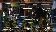 Green Day: Rock Band allows players to perform simulated rock music by providing up to four players with the ability to play three different controllers modeled after music instruments: a guitar controller for lead guitar and bass guitar gameplay, a drum controller and a microphone for vocals. Players simulate performances by using their controllers to play scrolling notes. For lead and bass guitar, this is accomplished by holding down colored buttons mimicking guitar frets and pushing the controller's strum bar. For drums, this requires striking the matching colored drumhead, or stepping on the pedal to simulate playing bass drum notes. When singing vocals, the player must sing in relative pitch to the original vocals. A pitch indicator displays the singer's accuracy relative to the original pitch. The game supports harmonies as introduced in The Beatles: Rock Band, allowing multiple singers to perform the vocal portion.[3] Harmonies will be added to the six songs already available as downloadable content for the game when played in Green Day: Rock Band.[4]