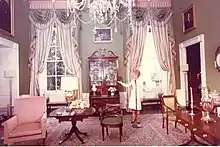 Little is known about the room's original decor, except that it was likely in the fashionable French Empire style of the day, a tradition that continued until a group of Colonial Revival and Federal-style furniture and art experts appointed by then President Coolidge sought to restore the room according to the period in which it was built, rather than a passing style of a later time. All subsequent work on the room followed Coolidge's lead, First Lady Jackie Kennedy most prominently. In 1961, she formed the White House Historical Association "to help the White House collect and exhibit the very best artifacts of American history and culture."[1] The same year, "Congress enacted Public Law 87-286 declaring that the furnishings of the White House were the inalienable property of the White House, legislating the White House’s status as a museum and extending legal protection to donated period furnishings and all White House objects."[2] An endowment for new acquisitions and the renovation of state rooms was created in 1979, with the help of former First Lady Rosalynn Carter.[2]
