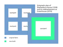 Work on-site began in December 2008.[27] The ground floor of Shaftesbury House was turned into car parking and plant rooms, and the cruciform inner wings demolished to create a single large courtyard. To achieve this, a JCB was craned into the existing courtyards, and some use was made of remote-controlled robots. The remaining fabric became an outer ring, entirely residential, while a new inner ring was built, with business space on the lower floors and residential space on the upper. Two entirely new floors were added on top of these.[28] This took the size of the building from 80,000 to nearly 140,000 square feet.[29] The framework and roof were completed during August 2009,[30] and the building was finished in April 2010, at which time it had 172 one, two and three-bedroom eco-apartments, and about 15,000 square feet of office space.[31][32] The building was officially opened by Hilary Benn MP on 1 October 2010.[33][34]