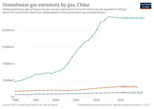 China experienced an increase in electricity demand and usage in 2017 as the economy accelerated.[30] According to the Climate Data Explorer published by World Resources Institute, China, the European Union, and the U.S. contributed to more than 50% of global greenhouse gas emissions.[31] In 2016, China's greenhouse gas emissions accounted for 26% of total global emissions.[32] The energy industry has been the biggest contributor to greenhouse gas emissions since the last decade.[31]