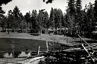 Greenland Lake is often intermittent, depending on winter snowfall; the lake is surrounded mostly by aspen, but also Ponderosa Pine, and Douglas Fir. It is a common water source for wildlife, especially deer. In historic times, cattle were grazed in the area, and a wood cabin (high-pitched roof for snow), was used for storage of salt, for cattle.