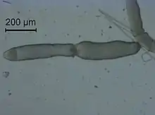 The lifecycle consists of several stadia: gametocyst - oocyst - sporozoite – trophozoite (chepaline) - gamont (gametocyte, sporadin) – gametocyst – oocyst. The gametocyst and oocysts are the cell structures that can survive outside the host-organism and infect other insects. The cycle starts with the oocysts that leave the body with the feces and are left on plant-material. When other locust than eat the plant with oocysts they will burst open (excystation) under the influence of the digestion of the locust. Eight sporozoites will then be released inside the digestive system of the locust.[1][13][14] Orthoptera regurgitate enzymes from the foregut and together with secretions of the salivary glands these enzymes can break down the oocyst cell wall and thus enable the freeing of the sporozoits. The free sporozoits than pass through the peritrophic membrane surrounding the midgut. Once in the ectoperitrophic space they can attach themselves to the epithelial cells of the caeca and midgut.[15][16][17]