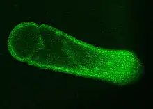 Gregarina garnhami is mainly found in the caeca and midgut of the desert locust where it attaches itself to the epithelial cells in order to feed.[1] The uptake of food happens through the epimerite, attached to the host cell, after a while also the developed protomerite and deutomerite can take up nutrients.[31] The uptake of nutrients happens through osmosis and pinocytosis (formation of a Cytostome). The nutrients are then stored as paraglycogen or fat.[11][32][33][34] The hundreds of foldings of the cell surface give eugregarines a substantial enlargement of the cell-surface in order to take up more nutrients.[35] More details need to be studied in regard of the nutrient uptake by gregarines, however, it is clear that they do not pierce the host cell to take up the cytoplasm. An apical complex is absent in the trophozoit stage in most eugregarines while it is this complex that is used by archigregarines for the uptake of nutrients by piercing the host cell. [34][31][33][15] Gregarina garnhami stays present as a extracellular organism in the host, not penetrating the cell membrane of the host.[2] The effect of G. garnhami on the host is not terribly severe but it is one of the few gregarines which are pathogenic. Harry 1970 found it to cause weight loss but not molting or feeding inhibition.[36]