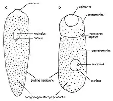 Gregarina garnhami is a gregarine that belongs to the septate eugregarines, meaning its cell is separated into parts. In G. garnhami, three parts can be seen: epimerite, protomerite, and deutomerite, but their visibility depends on the lifestage of the organism. A characteristic of gregarines is the typical construction of the pellicula that is formed by a cell membrane and two cytoplasmic membranes (the latter is often referred to as the inner membrane complex, IMC or alveoli). The membranes' proximity to one another often makes them difficult to distinguish. This structure is often also referred to as the trilayered structure. Beneath the inner membrane, a basal (internal) lamina can be seen, which separates the foldings around the cell from the rest of the cell. These foldings form the outer surface of G. garnhami, and hundreds of these can be observed at the surface enlarging the surface of the cell.[6][7][8][9][10] The cytoplasm of the cell (in the epimerite, protomerite, and deutomerite) is divided in two zones: ectoplasm and endoplasm. The ectoplasm is clear and does not contain much granular material. In the ectoplasm, the microtubules can be found. The endoplasm is less transparent and contains paraglycogen giving the cells a brown-yellowish color when viewing the cells with a light miscrope.[1][11][12]