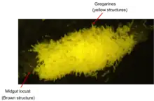 - 1 2 Valigurová, Andrea; Koudela, Břetislav (August 2008). "Morphological analysis of the cellular interactions between the eugregarine Gregarina garnhami (Apicomplexa) and the epithelium of its host, the desert locust Schistocerca gregaria". European Journal of Protistology. 44 (3): 197–207. doi:10.1016/j.ejop.2007.11.006. PMID 18304787.
