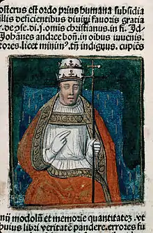 After Wenceslaus' coronation, Charles withdrew to Ugrin Csák's domains in the southern regions of the kingdom. Pope Boniface sent his legate, Niccolò Boccasini, to Hungary in May 1301.[39] The pope instructed Gregory Bicskei to support him in fulfilling his mandate, nevertheless his name is never appeared in the accompaniment of Boccasini following that, which also shows the permanence of his political isolation.[40] In October 1301, the legate summoned and convinced the majority of the Hungarian prelates to accept Charles's reign. The bishops, however, still did not recognize the legitimacy of Bicskei, as a result, Boccasini sent a letter to Pope Boniface, in which proposed that a consensual person fill the dignity. In response, Boniface warned his legate that he exceeded his powers, and preserved the personal selection of the archbishop for himself. The pope insisted on Bicskei, but he intended to maintain the status quo and did not confirm his 1298 election.[39][41] Bicskei stayed in the royal camp, when Charles laid siege to Buda, the capital of the kingdom, in September 1302, but Ivan Kőszegi relieved the siege.[42] When Bicskei issued a royal charter in Óbuda on 10 September, he was styled as "vice-chancellor".[29][39] Around that time, he excommunicated the leaders of the heretical movement in Buda.[43]