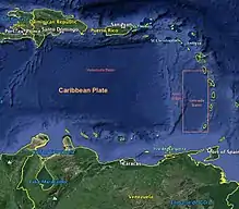 - ↑ Pérez, Omar J.; Bilham, Roger; Bendick, Rebecca; Velandia, José R.; Hernández, Napoleón; Moncayo, Carlos; Hoyer, Melvin; Kozuch, Mike (2001-08-01). "Velocity field across the Southern Caribbean Plate Boundary and estimates of Caribbean/South-American Plate Motion using GPS Geodesy 1994-2000". Geophysical Research Letters. 28 (15): 2987–2990. Bibcode:2001GeoRL..28.2987P. doi:10.1029/2001gl013183. ISSN 0094-8276.