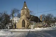 The Lutherans built their first Peace Lutheran Church in 1905[39] and a second, larger building in 1951, the old building being sold to the Ukrainian Orthodox congregation.[40] The Roman Catholics, originally of substantially Irish stock, built St Columbkill Church in 1903[41] and, with an influx of Polish and Ruthenian families found their numbers considerably increased[41][42] and by 1944 moved and extended the church building;[43] in 1979 they opened a second, completely modern church building.[43] Protestant Austrians organised the St John's Evangelical and Reformed congregation in 1888 and built two churches in succession in 1894 and 1903[43] before amalgamating with the United Church in 1964.[44] The Baptists purchased the town's disused first schoolhouse in 1895 for use as their church; their congregation dwindled over time and in the mid-1960s the Apostolic Church purchased the building; they subsequently built a new church and the Masons acquired the old Baptist church for use as a lodge.[44] The Grenfell Revival Centre opened in a disused Lutheran church building in 1960.[45] The Ukrainian Catholics initially affiliated themselves with the Roman Catholics and worshipped jointly with them; in 1921 they were able to build their own church and in 1957 acquired the Lutherans’ old and now disused church building.[46] In 1991 a re-constituted Presbyterian congregation was established in Grenfell as Trinity Presbyterian Church.[47]