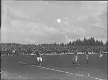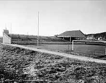 Construction was supported financially by among others NFF president Daniel Eie and director Johan Throne Holst. The lot, at the time in Aker, was owned by shipowner Olaf Ditlev-Simonsen and donated the land to the company. He also paid for a road, water and sewer line to the venue.[7] The official opening of Gressbanen took place on 1 September 1918, in front of an audience of 10,000.[6] The opening match was between a combined Kristiania team and AIK from Stockholm.[8] The venue was inaugurated as a national stadium the following year.[6] NFF remained a tenant at Gressbanen until 1926, when it moved its games to the newly constructed Ullevaal Stadion, which also served as the home of Lyn.[9] Gressbanen was iced for the first time in 1932.[10]