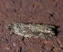 The wingspan is about 17 mm. Adults are gray with blackish-brown patches on the forewings. There are probably five or six generations per year.