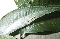 The larvae feed on the foliage of Carya illinoinensis. They also feed on young nuts in the spring and infest the shucks in the fall. The most serious damage occurs on pecan nursery stock, where the larvae feed on the terminal buds and unfolding foliage. The species overwinters as an adult. Pupation takes place in rolled-up leaves or infested buds and sometimes under bark scales. The larvae are about 12 mm long, creamy to dirty white when young and yellowish green with dark brown heads and necks when mature.[4]