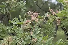 Grevillea decurrens, also known as the clothes-peg tree,[3] is a species of flowering plant in the family Proteaceae and is endemic to northern Australia. It is a shrub or tree with divided leaves, the lobes elliptic to egg-shaped with the narrower end towards the base, and conical groups of pink or cream-coloured flowers.