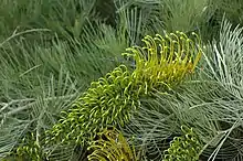 Grevillea formosa is a sprawling shrub that typically grows to a height of up to 1 m (3 ft 3 in), with trailing branches up to 2 m (6 ft 7 in) long. Its leaves are divided, 60–180 mm (2.4–7.1 in) long with 5 to 26 erect, linear leaflets, sometimes further divided, the end lobes 30–90 mm (1.2–3.5 in) long and 0.5–1.0 mm (0.020–0.039 in) wide. The edges of the leaflets are rolled under, but are not sharply-pointed. The flowers are arranged in toothbrush-like clusters along a rachis 120–300 mm (4.7–11.8 in) long. The flowers are green, turning bright golden-yellow as they age, the pistil 54–60 mm (2.1–2.4 in) long. Flowering occurs from January to March and the fruit is a shaggy-hairy follicle 11–16 mm (0.43–0.63 in) long.[3][4]