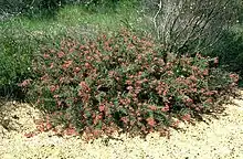 Grevillea hirtella grows in open heathland on sandy or loamy soils in scattered populations between Mingenew and Walkaway in the Avon Wheatbelt and Geraldton Sandplains bioregions of western Western Australia.[2][3]