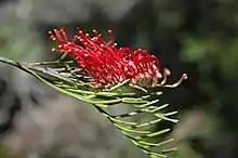 Grevillea hookeriana, commonly known as red toothbrushes or Hooker's grevillea,[2] is a species of flowering plant in the family Proteaceae and is endemic to the south-west of Western Australia. It is a spreading to erect shrub, usually with linear leaves or deeply divided leaves with linear lobes, and toothbrush-shaped groups of red, black or yellowish green flowers, the style maroon to black.