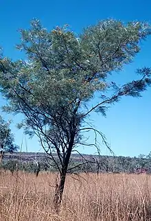 Plants from Queensland are non-lignotuberous shrubs to small trees with smooth bark and lighter inflorescences than other forms. A prostrate form which spreads up to 5 m (16 ft) across is found on exposed areas near Cooktown in north Queensland. Plants from Western Australia and the Northern Territory grow as a rough-barked lignotuberous shrub to small tree. A population of this last form from Kakadu National Park has all-silvery leaves.[4]