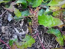 Creeping grevillea is found in montane eucalypt forests in two main areas in central Victoria: an eastern population centred in the Kinglake area, and a western population, from near Daylesford to the Lerderderg Gorge area.[3][7] Plants from the eastern region (the Mt Slide form) can reproduce both sexually by seed and clonally by 'root-suckering', and tend to display lower fertility than plants from the western (Daylesford) population which regenerate by seed or by re-shooting from a lignotuber after disturbance events such as fire.[8] Some clonally reproducing plants in the eastern region have been found to be triploid (three sets of chromosomes) compared to the usual diploid state for this species (2n=20).[7] The Lerderderg Gorge populations show a closer genetic and morphological affinity to plants from the Daylesford area than those from the Kinglake area. Western populations display the greatest range of floral colour variants (with green to dark red styles) while those in eastern populations range from dark red to deep burgundy.[6][7]