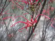 • Grevillea sarissa subsp. succincta McGill.[19] has red to deep pink and white, sometimes pale cream-coloured flowers with a similarly coloured style, from August to November.[4][20][21]