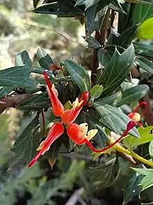 • Grevillea tripartita subsp. macrostylis (F.Muell.) Makinson, (previously known as Grevillea macrostylis) is a spreading shrub with triangular teeth or lobes, the flowers reddish to orange and yellow to cream-coloured flowers mainly from August to December.[8][9]