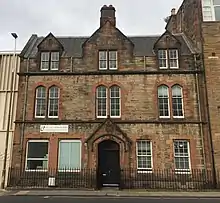 The Kirk o' Field building was constructed in 1912 to a design of James Bow Dunn, which imitates the late Scottish Gothic style. The front elevation centres on a curvilinear traceried window and is flanked by a short steeple with a red-tiled spire and a corbeled, battlemented parapet.[5][35][36] From 1956, the church possessed a speaker system to play recorded bell music from the tower. This ceased during the following decade.[37] Next door are the St Ninian's Mission buildings with a hall to the rear, which initially served as the mission church.[5][2] The St Ninian's Mission buildings were designed by Robert Wilson and were opened in 1891. The former church officer's house stands on Brown Street behind the former Kirk o' Field building.[5]