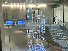 Throughout the day the sculpture responds to reputable news feed and displays snapshots of the current headlines, written in full height of the atrium. At the end of each day's trading the spheres return to their cubed arrangement, resting on the sculpture's base, and blue lights inside each sphere are illuminated to show the stock market's closing price with an arrow to indicate how the market performed on that particular day. Her Majesty Queen Elizabeth II unveiled the sculpture on 27 July 2004[2] and the opening was broadcast to a global audience. The installation is broadcast every morning on television to an estimated global audience of 80 million people.[3][4] It was nominated for an Interactive BAFTA award in 2005.