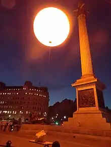 For their most recent artwork, greyworld created a large spherical self illuminated "Sun" which was installed in Trafalgar Square, London for one day only. Weighing 2.5 tons, and using 210,000 watts of power, the Sun illuminated the Square for three hours after sunset.