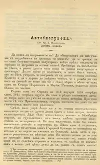 The first page of Parlichev's autobiography published by the Bulgarian Ministry of Education in the magazine Folklore and Ethnography Collection, a year after his death in 1893.