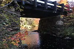 The Grist Mill Bridge is located in a rural part of far eastern Lebanon. The Little River Road runs generally southward, roughly following the course of the eponymous river as it makes its way south to the Salmon Falls River in Berwick. A short way south of the Lebanon-North Berwick Baptist Church, the road crosses the river at a point where it makes an S-shaped bend to the west. Just downstream (west) of the bridge stands the Old Grist Mill, which was built in 1774. Documents describing this mill indicate that a bridge was already standing at this location when it was built. State records of the bridge include photographic evidence from 1924, and records noting replacement of its deck in 1885. Documentary references to bridges at or near this location were also made in 1792 and 1822, but none of the documentation predating 1885 is conclusively connected to the present structure. The stonework of the bridge supports bears some resemblance to that of the mill foundation and what remains of its dam.[2]