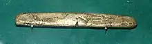 As its etymology implies the word originally meant a necklace or a torque. The reason why it has taken the meaning of a unit of weight is unclear. The grivnas that have been found at various archaeological sites are not necklaces but bullions of precious metals, usually silver. The weight and the shape of grivnas were not uniform, but varied by region. The grivnas of Novgorod and Pskov were thin long round-edged or three-edged ingots, while Kievan grivnas have rather the shape of a prolonged rhombus. The material was either gold or silver, but silver was predominant.[3] Originally the weight of a grivna was close to the Roman or Byzantine pound. The weight of the Kievan grivna was around 140–165 g (0.309–0.364 lb). The Novgorod grivna had the weight 204 grams (0.450 lb) and became the basis for monetary systems in northeastern Rus', including the emerging Grand Duchy of Moscow.[4]