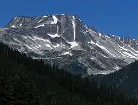 Grizzly Mountain is a 2,754-metre (9,035-foot) mountain summit located in Glacier National Park, in the Hermit Range of the Selkirk Mountains in British Columbia, Canada. Grizzly Mountain is situated 57 km (35 mi) northeast of Revelstoke, and 42 km (26 mi) west of Golden. It is also set 4 km (2.5 mi) north of Cheops Mountain, and 3 km (1.9 mi) west of Rogers Pass from which it can be seen from the Trans-Canada Highway. The closest peak to Grizzly is Ursus Minor Mountain, 1.27 km (0.79 mi) to the west-southwest, and its nearest higher peak is Mount Sifton, 2.35 km (1.46 mi) to the north.[3] The first ascent of the mountain was made August 31, 1901, by John E. Bushnell, August S. Eggers, Karl Schuluneggar, and Friedrich Michel via the southeast couloir.[1] The first ascent of the north ridge was made in 1921 by Neal Carter, Tom Fyles, and Don Munday. The class 5.2 west ridge was first climbed by Georgia Engelhard and Ernest Feuz in 1933. The mountain's name was adopted in 1906, then re-approved September 8, 1932, by the Geographical Names Board of Canada.[2] It was so-named because of its proximity above Bear Creek (since renamed Connaught Creek), and in keeping with the bear theme of other nearby features such as Ursus Major Mountain, Ursus Minor Mountain, Bruins Pass, and Balu Pass.[4]