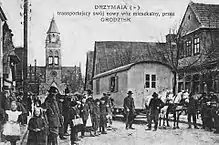 During World War II, the town was under German occupation. In Młyniewo, a nearby village, a transit camp was formed for onward transport to Nazi concentration camps, initially for Jews and later for Poles and French, Serbian, English and Soviet prisoners of war.[1] Poles were also subjected to expulsions, the first of which was carried out in November 1939,[4] nevertheless, the Polish resistance movement was active in the town.[1] Poles from Grodzisk were among the victims of massacres perpetrated during the genocidal Intelligenzaktion campaign at Rydzyna in November 1939.[5] Several Poles from Grodzisk, including policemen, doctors, and a co-founder of the local Dyskobolia Grodzisk Wielkopolski football club, were murdered by the Russians in the large Katyn massacre in April–May 1940.[6] The Germans operated a Nazi prison in the town,[7] and a subcamp of the Stalag XXI-C prisoner-of-war camp, which in June 1941 was converted into the Stalag XXI-E POW camp for British, Polish and Serbian POWs, and into the Oflag XXI-C POW camp for Allied officers in March 1942.[8] Heliodor Jankiewicz, commander of the local unit of the Narodowa Organizacja Bojowa organization, was arrested by the Germans in September 1941, and then sentenced to death and executed the following year.[9] On January 27, 1945, the city was taken by the Red Army, and afterwards restored to Poland.