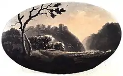 During the 19th century there were two translations of Dyer's celebration of the Welsh countryside at the tail end of the Welsh literary renaissance. The first was the “Duoglott Poem, faithfully imitated” as Twyn Grongar by Rev. Thomas Davies in 1832.[27] A second, Bryn y Grongaer, was written by William Davies (1831–1892) under his bardic name of Teilo.[28] The site itself was painted early in the century by Henry Gastineau and later appeared as a woodcut in Wales Illustrated (1830).