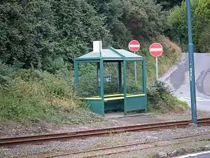 This halt serves the nearby holiday cottages in the Groudle Glen valley and provides an alternative access stop for the Groudle Glen Railway on the other side of the valley. It is serviced by a modern bus-type shelter which was installed in 1999 in line with the management policy of the era. This shelter provides a dual purpose, as a limited bus route also operates on the road that runs parallel to the tram line formation. When the shelter was installed a short section of lineside was faced with tarmacadam to allow access to it, and advertisements for both railways appear therein.