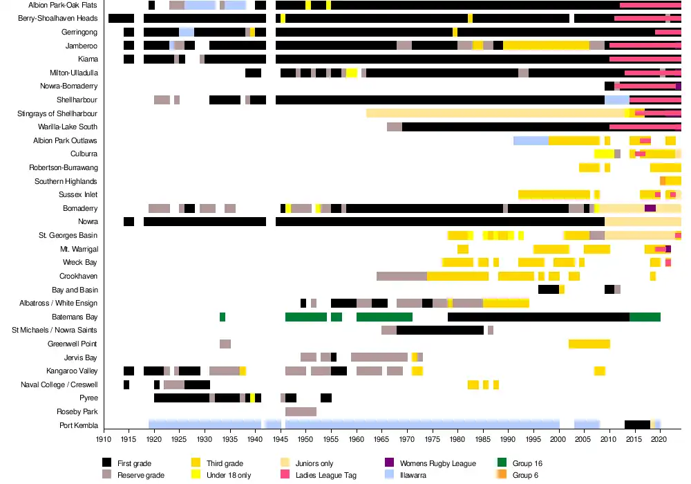 The graph below shows the participation of all current and most former clubs. The club's highest grade in a particular year is displayed. The source is a compilation of competition tables, point scores and lists of participating teams. These have been taken from the Kiama Independent, Illawarra Mercury and other past newspapers on Trove and microfilm. The current South Coast Group 7 Official Historian has assisted with the provision of more recent tables as printed in association guidebooks and the South Coast Register. Further research may add seasons the juniors only clubs participated which are currently not shown.