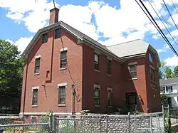 The Grove Street School is a historic school building at 23 Grove Street in Spencer, Massachusetts. The 2+1⁄2-story brick building was built in two phases: in the first phase in 1876, a single story was built. It was full to overflowing by 1878, and in 1883 the second story was built, designed by Fuller & Delano. It is a T-shaped building, whose main body is a horizontal rectangle, with a projecting central pavilion. The three roof gable ends are jerkin-headed, and are decorated with bargeboard and heavy brackets.[2]