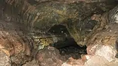 Along the cavern walls are speleological structures such as lateral benches, lava bridges, branching galleries, lava balls, stalactites, stalagmites, columns, spongy lavas, glaze and tree moulds.[1] Apart from several cracks, the walls and ceiling are multi-coloured (orange to yellowish) due to the basalt oxidization. There are also conical-shaped stalactites, secondary mineral deposits of silica and earthen deposits covering the walls and ceiling.[1] Many of the stalagmites are 25 centimetres (9.8 in) long with long sections of superimposed, soda-straw, conical ring-type tubes with pitted pockets.[1]