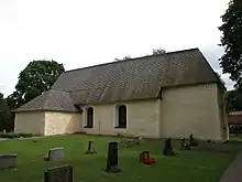 Christianity made inroads in areas already in the 11th century, as the Christian crosses on rune stones in the area suggest. The first church building was probably made of wood. The building material of this single-nave church with a rounded apse is fieldstone. The church was enlarged sometime later, probably circa 1250–1350.[1]